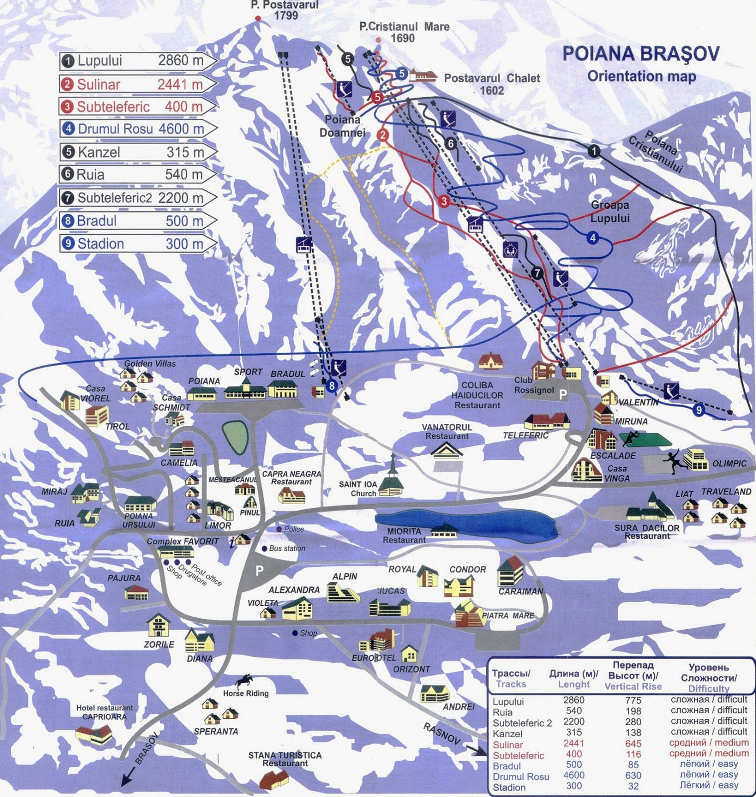 Горнолыжные трассы и подъемники Пояна Брашов: - Друмул Рошу (легкая), длина - 3821 м, перепад высот - 630 м