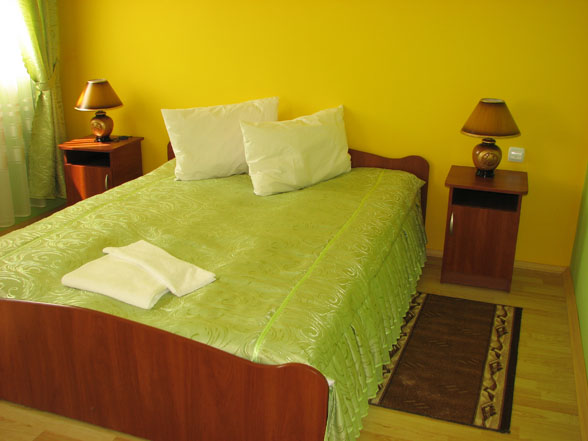 Двухместный - двуспальная кровать, кондиционер, телевизор, телефон, шкаф для одежды, санузел (туалет, умывальник, душевая кабина). Есть номера улучшенные - большие по площади.