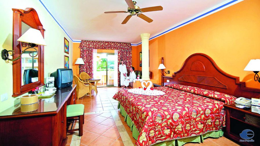 У номері: 2 двоспальні ліжка або 1 подружня, диван-софа (вітальня і спальня - один простір), ванна кімната з гідромасажним душем, фен, банні приналежності Don Pablo Collection, халат і тапочки, рушники для басейну в номері, кондиціонер, стельовий вентилятор , телевізор (супутникове ТБ), телефон, сейф (безкоштовно), міні-бар з алкогольними напоями, кавоварка і кавові приналежності, праска і прасувальна дошка, балкон або тераса, доступ в інтернет в lobby (безкоштовно 15 хв. / день), Wi -Fi в lobby, Room service 24 години. Харчування: Al Пляж: власний, піщаний (Playa Bavaro). Парасольки, шезлонги, матраци - безкоштовно. Пляжні рушники - безкоштовно. У басейну: парасольки, шезлонги, матраци - безкоштовно. |