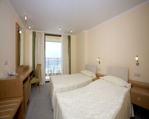 Розташування: Затишний готель-люкс. Комфортабельний окремий комплекс "Каліакра" (Kaliakra) 4 * знаходиться в декількох хвилинах від центру, поруч із пляжем, реконструйований у 1999 році. Всі номери з видом на море. Розташований на першій лінії чудового болгарського курорту Албена, в 20 метрах від піщаних пляжів Чорного моря та в 5 хвилинах ходьби від центру курортного містечка. Опис готелю: Два корпуси один з яких відповідає категорії «Суперіор», а інший - «Стандарт» 10 апартаментів, 130 - двомісних стандартних і 103 номера Суперіор, 30 одномісних і 1 номер для інвалідів; 1 панорамний і 5 внутрішніх ліфтів; хол із зручними місцями для відпочинку і безкоштовним Інтернет. В готелі: ресторан, бар, відкритий басейн, кафе, sky-бар, обмін валюти, парковка, бізнес-центр, інтернет-кафе, хімчистка, сейф, прокат автомобілів, конференц-зал, магазини, бар біля басейну, масаж. У номері: ванна, балкон, телевізор, телефон, радіо, мінібар, душ, супутникове телебачення, туалет, холодильник. Харчування: Тип харчування в готелі: все включено (AL) - шведський стіл. У пакет "все включено" входить: сніданок - 07:30-10:00, пізній сніданок - 10:00-11:00, обід - 12:30-14:30, вечеря - 18:30-21:30, пізній вечеря - 24:00-02:00, тематичні вечори - болгарський національний, італійської, морський, обід і вечерю в А-ла-карт ресторані в Албені за вибором (для туристів, що приїжджають до 08.07.11 після 26.08.11), піца , салати, фрукти, морозиво, BBQ раз на тиждень у снек барі біля басейну, болгарські та імпортні алкогольні та безалогольние напої і коктеклі в основному ресторані і в барах - 24 години на добу, міні бар. Для дітей: дитячий басейн; дитячий майданчик; міні-клуб / дитяча кімната. Розваги і спорт: амфітеатр, бадмінтон, шахи, нарди. Анімаційне шоу для дорослих мінімум 4 рази на тиждень. Настільний теніс; тенісний корт; волейбол; центр верхової їзди; аеробіка; водні види спорту на пляжі; дискотека; анімація. Море / пляж в Kaliakra Superior: Піщаний пляж знаходиться поряд з готелем. Парасолька і шезлонг на пляжі надаються безкоштовно. |