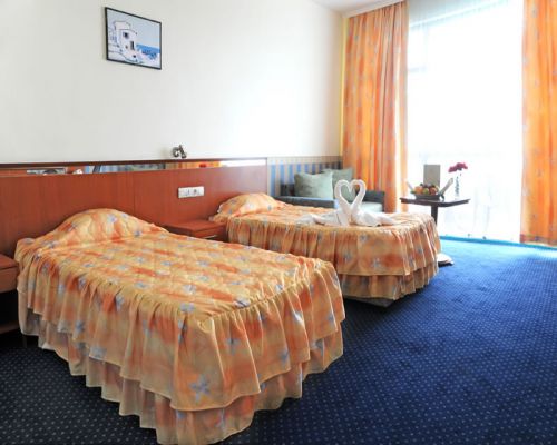 Готель: розташований в 80 м. від пляжу. В готелі: ресторан з терасою, кафе, відкритий басейн з баром, закритий басейн із джакузі, бальнеоцентр, солярій, сауна, лазня, косметичний центр, фітнес зал, перукарня, сейфи на рецепції, конференц-зал, дискотека. У номері: кондиціонер, телефон, міні-бар, сейф, телевізор, WC з ванною, фен, балкони. |