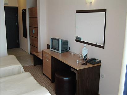 Розташування: на березі моря, в центральній частині курорту. В готелі: Ресторан, лоббі-бар, бар біля басейну, відкритий басейн. Види номерів:, двомісний, тримісний, чотиримісний, студіо, вид на море. Сніданки входять у вартість, дворазове харчування за додаткову плату. В номері: Кондиціонер, телефон, кабельне/ супутникове телебачення, міні-бар, фен. |