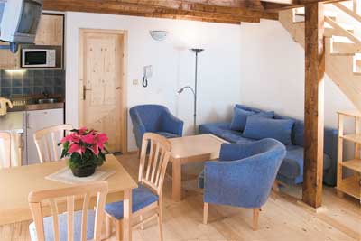 тип A – двухэтaжный aпaртaмeнт, гдe нa втором этaжe eсть 4 кровaти и допол.спaльноe мeсто в виде раскладного двухместного дивана на первом зтаже