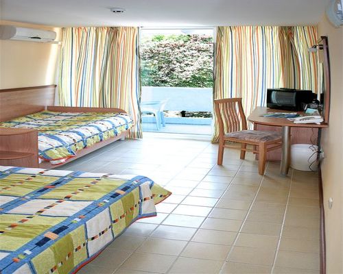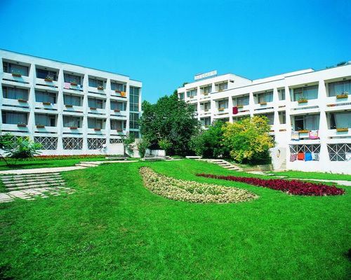 Розташування: в 600 м. від пляжу, посеред пророднього парку. В готелі: 4 поверхи, 2 ліфти, 138 двомісних номерів. У номері DBL: 15 кв.м. (Макс.розміщення 2+1), кондиціонер, супутникове телебачення, телефон, душ, балкон, Wi-Fi, на підлозі керамічна плитка, можливість додаткового місця для дитини, готель може надати холодильник в оренду. Харчування: шведський стіл - сніданок з 7.30-10.00 год, обід з 12.00-14.30 год, вечеря з 18.00-21.00 год Інтернаціональна кухня, вегетаріанські та дієтичні страви, дитячий буфет з багатим розмаїттям каш, супів, свіжих овочів і фруктів, з 11.00-16.30 год морозиво місцевого виробництва. Тематичні вечори болгарської, італійської національної кухні, вечір морепродуктів - 1 раз на тиждень. З 10.00-23.00 год в лобі-барі і барі біля басейну безкоштовно алкогольні та безалкогольні напої місцевого виробництва, кава, чай, вино, розливне пиво. Напої іноземного виробництва за дод. плату. Примітка: після 23,00 год всі напої в барах за дод. плату. На пляжі: піщаний пляж, шезлонги і парасолька на номер - безкоштовно, біля басейну безкоштовно. Басейни: відкритий басейн. Ресторани: основний ресторан. Бари: лобі-бар, бар біля басейну. Послуги: обмін валют, магазини, пральня, парковка, сейф за дод. плату, WiFi в лобі-барі. Спорт і розваги: настільний теніс, волейбол, анімація - безкоштовно; тенісний корт, водні види спорту, більярд, інтернет-кафе - платно. Для дітей: міні-клуб, дитячий майданчик, дитячий басейн з міні-аквапарком, дитяче ліжечко, дитячий стільчик. |