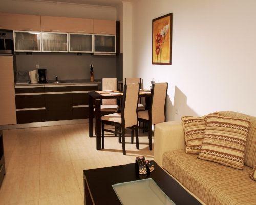 В апартаментах: Спальня: два одномісні ліжка або одне велике двомісне ліжко, кондиціонер, шафа, дзеркало, комплект постільної білизни, рушники. Вітальня: диван, обідній стіл, м'які меблі, телевізор. Кухня: холодильник, духовка, посуд, кавоварка, мікрохвильова піч і ін. Коридор з дзеркалом. Ванна кімната: душ і всі необхідні засоби для душу. Додаткові зручності: сушарка, праска і дошка для гладіння, стіл і стільці на балконі.