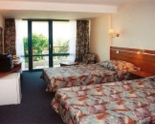 Загальне розсташування Розташований в південній частині курорту Золоті Піски за 80 м від пляжу. Бальнеологічний центр готелю оснащений сучасним обладнанням, басейн наповнений мінеральною водою, є тренажерний зал і сауна. Готель Чотири поверхи, сейф на ресепції (€), відкритий басейн, закритий басейн, інтернет-клуб, магазин,обмін валюти, парковка, багато зелені. Номер 19 кв.м., два окремі ліжка, кондиціонер, холодильник, балкон, супутникове ТБ, телефон, підлога - ковролін, ванна або душ. |