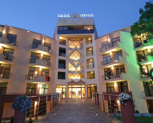 Розташування готелю: Парк-готель Одесос розташований в південній частині курорту Золоті Піски, всього в 150 метрах від пляжу, оточений прекрасним парком зі старими деревами.