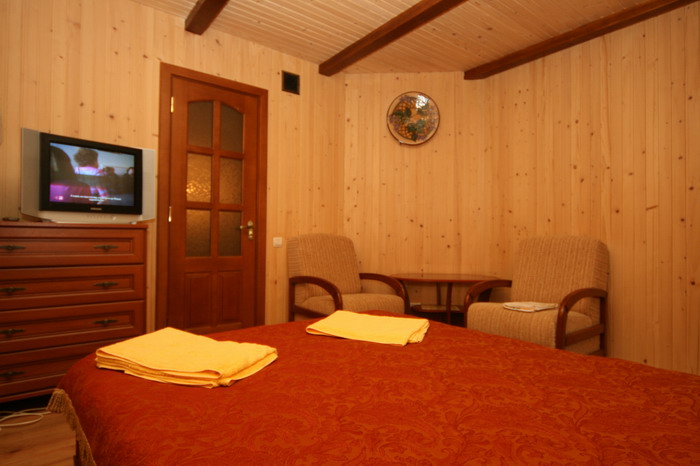 Розташування: У селі Татарів, 82 км від м. Івано-Франківська. Під'їзд — вкатана грунтова дорога, 400 м від траси. Опис: Два дерев'яні двоповерхові котеджі (26 місць), сауна, альтанка з мангалом, літній басейн, дитячий майданчик. Котедж №1 Є кухня-їдальня і 4 номери: люкс, півлюкс і 2 двомісні стандарти. Стандарт — двоспальне ліжко, телевізор, шафа для одягу, санвузол (душова кабіна, в одному — ванна, туалет, умивальник). Додаткові місця — розкладний диван. Півлюкс — студіо-номер з каміном, двоспальне ліжко, телевізор, розкладний диван, шафа для одягу, санвузол (душова кабіна, умивальник, туалет). Люкс — двокімнатний номер, спальня (двоспальне ліжко), вітальня (розкладний диван, телевізор, шафа для одягу), санвузол (душова кабіна, умивальник, туалет). Котедж №2 (4 номери). Кожний номер має окремий вхід знадвору. На першому поверсі — люкс: вітальня (м'який куток, камін, шафа для одягу, стіл, електорчайник, посуд), спальня (двоспальне ліжко, телевізор), санвузол (душ, туалет, умивальник, біде). На другому поверсі — 3 півлюкси (двоспальне ліжко, диван, телевізор, шафа для одягу, столик, електрочайник, посуд, санвузол — душ, туалет, умивальник, біде). Харчування: За домовленістю. Українська та європейська кухня, гуцульські страви. Користування кухнею — за домовленістю. До найближчого магазину, кафе — 500 м. Сервіс, включений у вартість: Паркінг. Інтернет Wi-Fi, супутникове телебачення. Прання одягу, користування праскою. Прибирання кімнат, зміна рушників, постелі — за потребою. Сервіс за додаткову оплату: Сауна з кімнатою відпочинку. Спорт, розваги: Відкритий басейн (7,5х4,2 м, глибина — 1,5 м) — безкоштовно. Дитячий майданчик. Рафтинг, прокат квадроциклів. Походи в гори, екскурсії, збирання грибів та ягід, катання на конях, настільний теніс. Трансфери до витягів у Буковель (12 км). Ціни 2015 - 2016рр. за номер за добу (грн): Номер/Період 22.09-25.12 26.12-08.01 09.01-07.03 стандарт 444 800 444 півлюкс з каміном 667 1200 667 люкс 778 1800 778 Новий рік — за домовленістю. За потребою дитяче ліжко надається безкоштовно. |