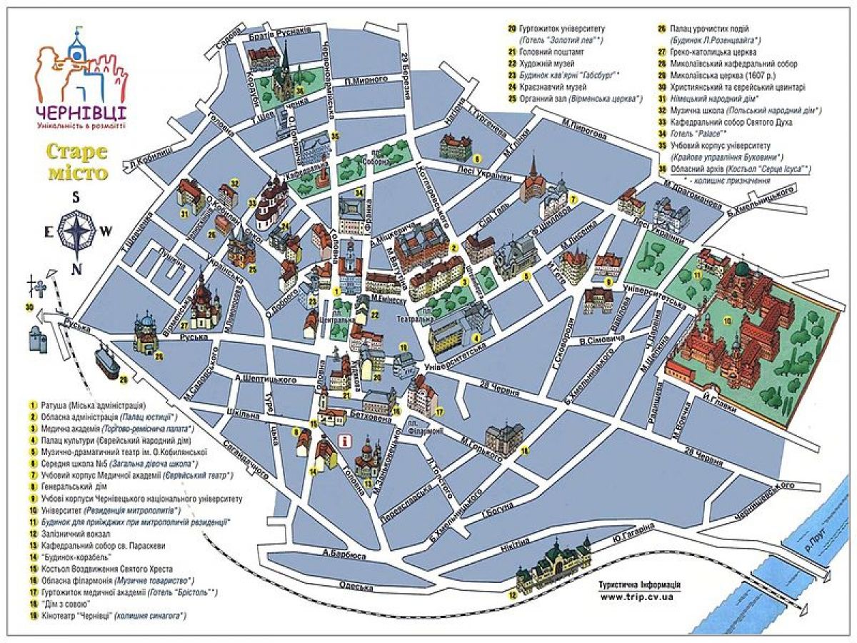 Туризм та екскурсії Впродовж віків Чернівці сформувались як місто з унікальною різностильовою архітектурою, багатою культурною спадщиною і толерантною атмосферою. Його планування при значних перепадах у рельєфі створює розмаїття краєвидів, обрій яких ускладнюють куполи храмів різних конфесій та годинникова вежа міської ратуші. Вгору від річки Прут тягнуться старовинні вулички, звивисті, зламані крутими поворотами. На пологій частині схилу вони утворюють густу вуличну мережу, прорізану широкими магістралями, що ведуть до Центральної площі Чернівців. Екскурсія історичним середмістям австрійської доби дасть змогу ознайомитися з архітектурним ансамблем XIX — початку XX століть, який відомий своїми стильними сецесійними будовами, створеними представниками віденської школи модерну Отто Ваґнера. Архітектурною перлиною Чернівців по праву вважається ансамбль колишньої Резиденції митрополитів Буковини і Далмації, включений до списку об'єктів всесвітньої культурної спадщини UNESCO. З Чернівців можна здійснити цікаві заміські екскурсії. Неподалік від міста розташовані 2 із семи чудес України: Хотинська (70 км) та Кам'янець-Подільська фортеці (100 км), а також перлина Українських Карпат — м. Яремче (130 км). У Чернівцях є близько 20 готелів загальною місткістю понад 1300 місць, які пропонують номери від «економ-класу» до «люкс-апартаментів». Майже всіма готелями надаються послуги харчування у власних ресторанах, паркування автомобіля тощо. У місті працюють понад 300 ресторанів, барів, кафе та піцерій на будь-який смак і гаманець: від закладів швидкого харчування до ресторанів традиційної української та вишуканої французької кухні. У Чернівцях є понад 700 магазинів, близько десяти торговельних центрів, а також один із найбільших ринків західної України — «Калинівський», де можна знайти будь-який крам. Музично-драматичний театр, численні мистецькі заклади та палаци культури, філармонія, кінотеатри, нічні клуби і розважальні комплекси роблять дозвілля чернівчан і гостей міста цікавим і насиченим. Популярним місцем відпочинку дорослих і дітей є центральний парк культури і відпочинку. Тут працюють різноманітні атракціони, кафе, бари, танцювальний майданчик просто неба, літній театр, відкритий тенісний корт тощо. |