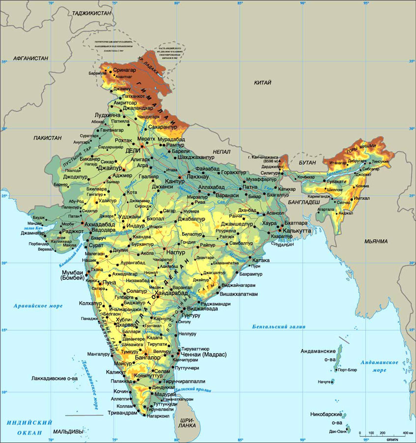 Індія - розташована в Південній Азії. На півночі країна межує з Афганістаном, Китаєм, Непалом і Бутаном, на сході - з Бангладеш і Бірмою, на заході - з Пакистаном. На Сході омивається Бенгальськім затокою, на Півдні - Полкськімською протокою, що відокремлює її від Шрі-ланки та Індійським океаном, на Заході - Аравійським морем. Священні річки - Ганг, Інд, Брахмапутра. Вища вершина - Чогорі на півночі (на межі з Китаєм) (8611 м).