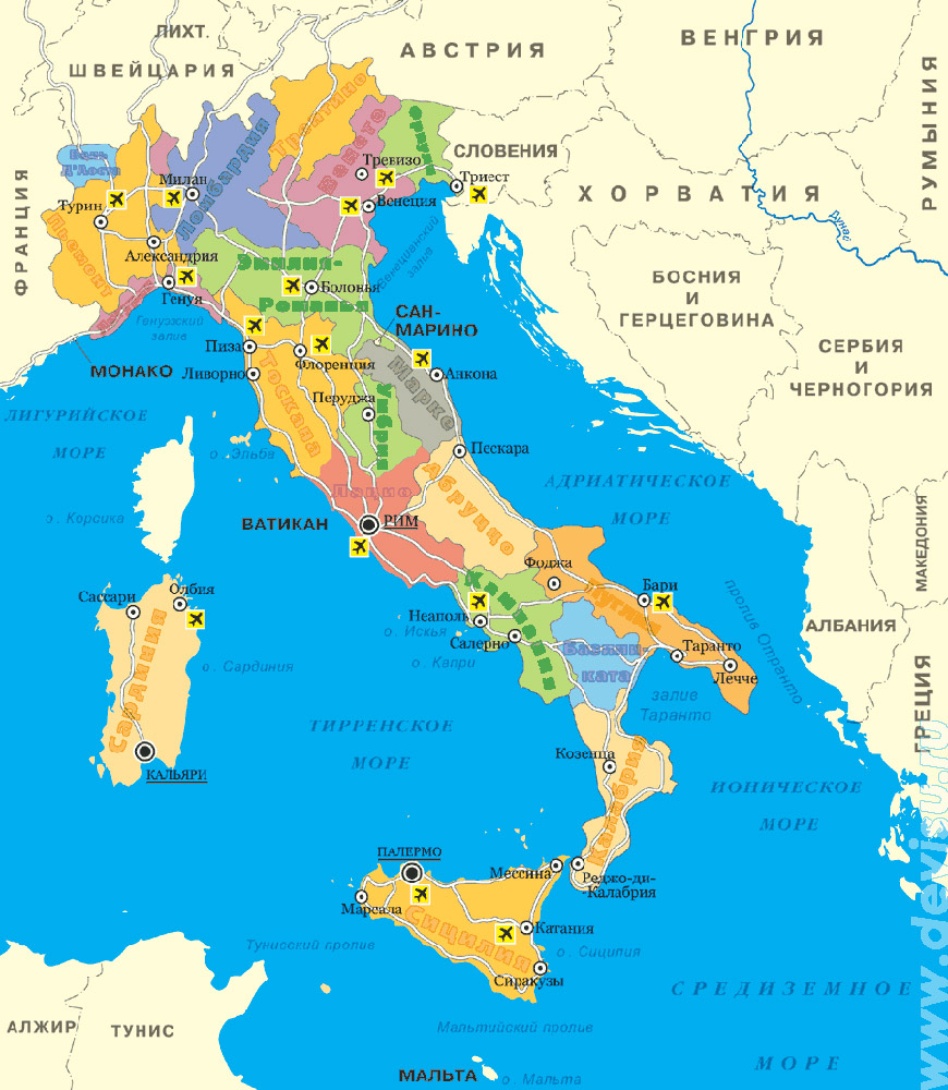 Італія - країна на півдні Європи, на Апеннінському півострові. Італія була засновником європейської цивілізації при її появі. Величність Італії нас надихає на кожному кроці. На півночі межує зі Швейцарією й Австрією, на сході - зі Словенією, на північно-заході - із Францією. Обмивається на заході Лігурійським і Тірренським морями, на сході - Адріатичним, на півдні - Іонічним і Середземним морями. Італії також належать острова Ельба, Сицилія й Сардинія. На території Італії знаходяться дві міні-держави: Ватикан і Республіка Сан-Маріно. Місцем для відпочинку може бути Бібіоне чи Ріміні. Чудово на півострові Гаргано з незайманим узбережжям. Не забудьмо й про італійський острів Сардинія, що омивається прозорим блакитним морем. Італія — це країна з великою європейською історією. Це все залишило Італії безліч історичних пам'яток спадщини: часи Римської імперії, середньовічні часи, аж до самої новітньої історії. Італія приваблює туристів Римом, Флоренцією та Венецією. Італія досить маленька країна, та має стільки відомих міст: Рим, Мілан, Турін, Флоренція, Венеція, Неаполь, Болонья — це все міста, про які кожен в цьому світі щось чув. Рим вам запропонує історію, Флоренція та Венеція — романтичні прогулянки, а Неаполь запропонує атмосферу мафії та банд. В Болоньї ви знайдете найстаріший у світі університет. Територія - 301.3 тис. кв.км. Населення - 57,5 млн. чоловік. Столиця - Рим. Валюта - Євро. |