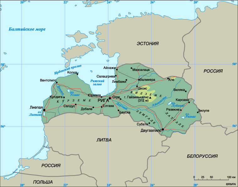 География Латвия расположена в Восточной Европе. Общая площадь страны - 64,5 тыс. кв. км. На севере она граничит с Эстонией, на юге - с Литвой, на востоке - с Россией и Белоруссией. На западе омывается Балтийским морем. Рельеф в пределах страны - равнинный со слабовыраженными холмами. Средние высоты - 100-200 м над уровнем моря, высшая точка - гора Гайзинькалнс (имеет высоту 312 м над уровнем моря). На территории Латвии более 700 рек, все они относятся к бассейну Балтийского моря. Главная река страны - Даугава, протекая по территории России имеет название Западная Двина, другие важные реки - Гауя, Лиелупе и Вента. На юго-востоке страны расположены заболоченные местности и озера.